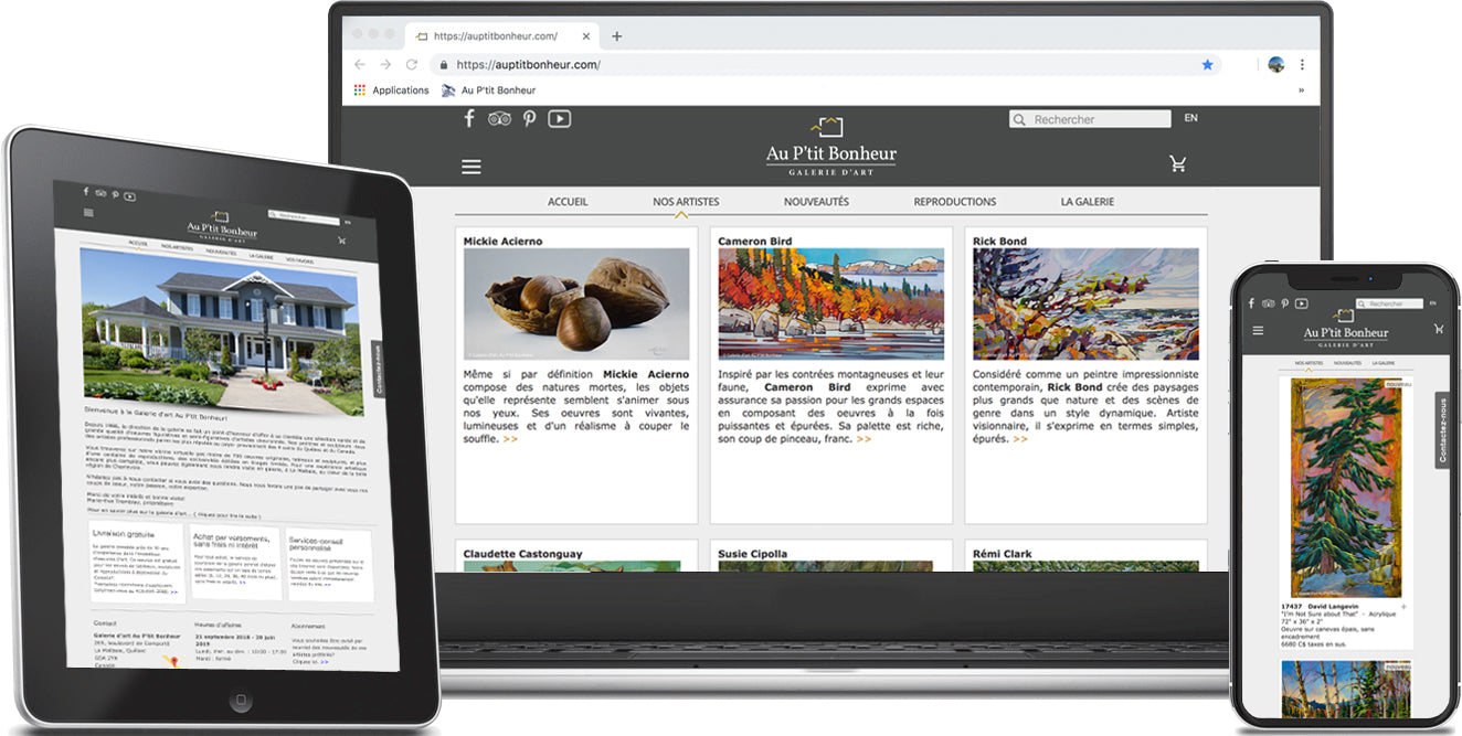 Résolument tournée vers l'avenir, la galerie se donne le mandat et les moyens de faire rayonner le talent de ses artistes, notamment grâce à son site web, le www.auptitbonheur.com. On retrouve sur cette vitrine virtuelle pas moins de 600 œuvres originales, tableaux et sculptures, et plus d’une centaine de reproductions éditées en tirages limités. Et toutes les œuvres présentées en ligne sont disponibles en galerie : les œuvres qui trouvent preneur sont retirées du site dans les plus brefs délais. Avec ses mises à jour constantes, la clientèle peut y découvrir de nouvelles entrées, à toutes les semaines, au gré des arrivages… et de l'inspiration des artistes!
